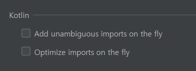 코틀린도 마찮가지로 Add unambiguous imports on the fly와 Optimize imports on the fly도 체크해주시면 됩니다.